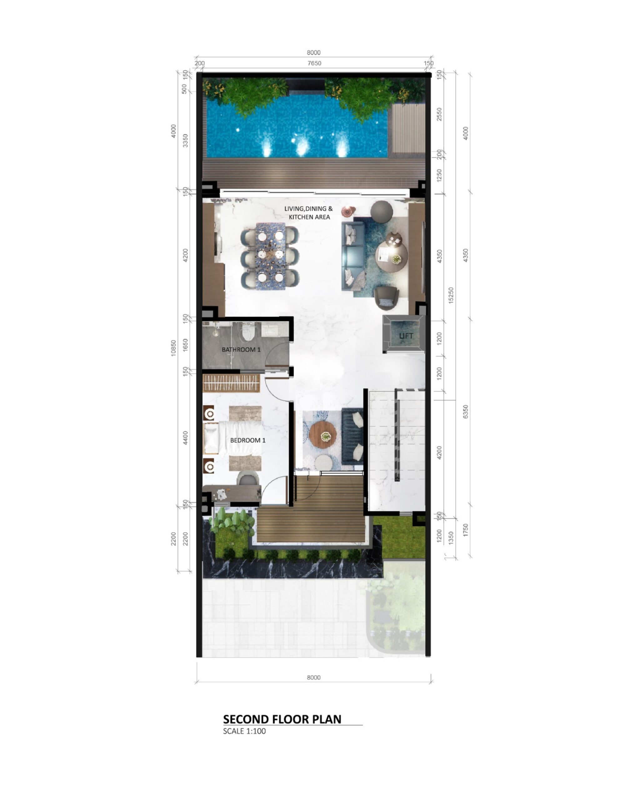Lantai kedua menawarkan ruang terintegrasi yang indah untuk kebersamaan keluarga dan relaksasi. Balkon terang yang menghadap jalan perumahan menghadirkan cahaya alami dan udara segar, sementara area ruang tamu, ruang makan, dan dapur mengalir harmonis untuk kehidupan sehari-hari dan hiburan. Lantai ini juga dilengkapi kamar tidur tamu dengan kamar mandi dalam dan kolam renang pribadi, menciptakan suasana ala resor dalam kenyamanan rumah Anda.