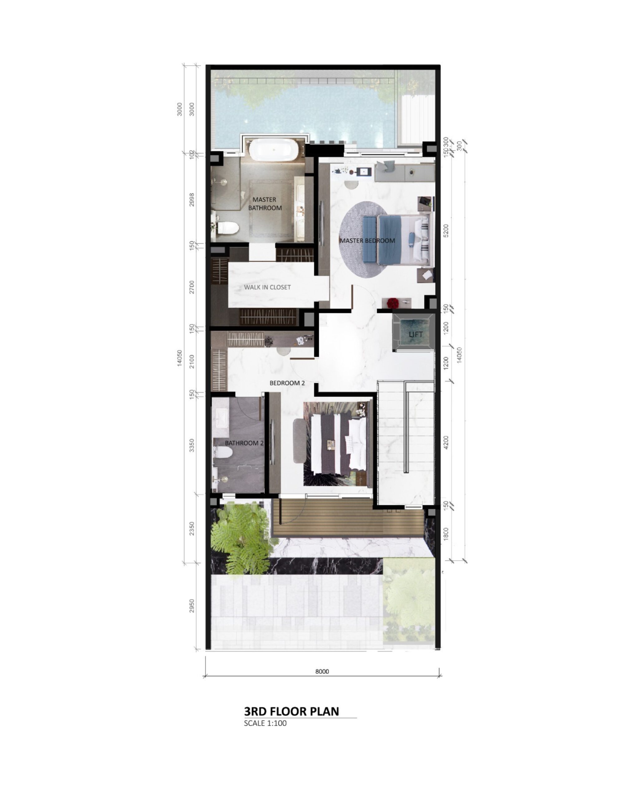 Lantai teratas adalah surga ketenangan dan kemewahan. Melangkah ke balkon dengan pemandangan lingkungan yang tenang, lalu beristirahatlah di kamar tidur utama, lengkap dengan kamar mandi pribadi dan ruang ganti untuk kenyamanan yang mewah. Sebuah kamar tidur tambahan dengan kamar mandi dalam melengkapi lantai ini — menawarkan privasi, ruang, dan keanggunan untuk setiap anggota keluarga.
